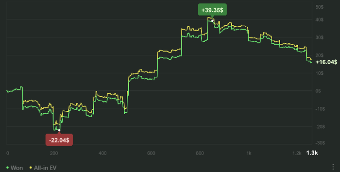 Результат хороший, но мог быть гораздо лучше. Проиграл 2 крупные раздачи, которых можно было избежать.