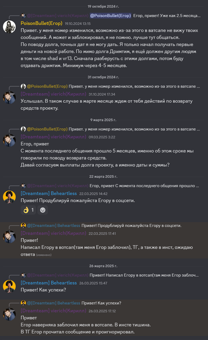 – В последнем диалоге осенью 2024 года Егор пообещал начать выплаты в марте 2025, ссылаясь на начало работы,