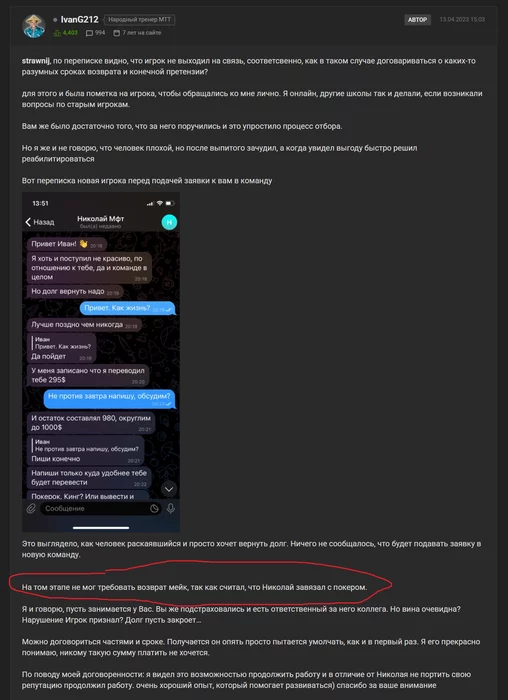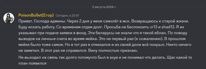 Да, я ушёл некрасиво, ещё и бабки спиздил. Ребята за меня всё выплатили за пару недель. Это небольшое недоразумение думаю можно забыть. Долг вам вернули довольно быстро.