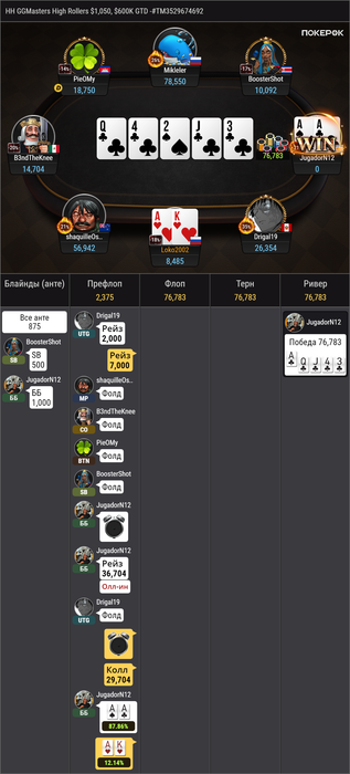 Через некоторое время после этой дорогой раздачи со стеком 7ББ запушил с BU, на SB колл. AQs<JJ, вылетел 142м.