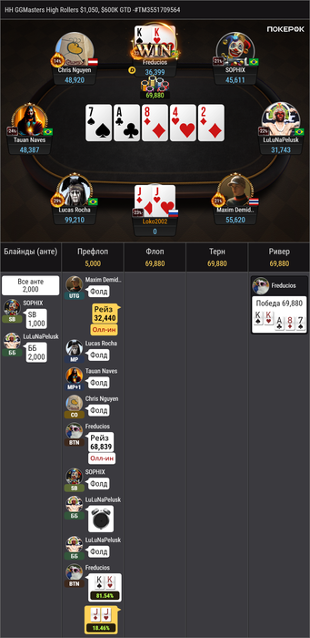 Оппонента посадили к нам незадолго до этой раздачи, % 3-бета у него был 6%, но раздач сыграно немного, выборка маленькая. Я думал, что со стеком 37ББ на данной стадии турнира в его диапазон 4-бет пуша входят JJ-KK, АКо, AJ-AKs, частично 99-ТТ. Ожидал, что АА чаще всего уйдут в 4-бет без пуша. Скорее всего, моего стека хватило бы досидеть до призов, сбрасывая все карты. +1900$ могли бы стать важным пополнением банкролла, но мы же не для минкэша играем в покер, играть для минкэша ошибочно и на дистанции минусово. В случае удвоения вошёл бы в топ-20 чипкаунта.