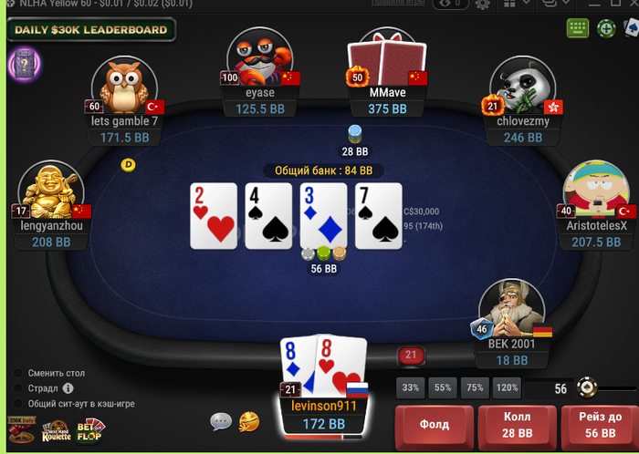 Низ доперов которые могут его переехать ты сам отрезаешь на префлопе (скидывая в пас) или может кто то колит 84 на рейз от фиша?