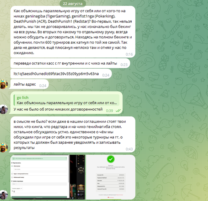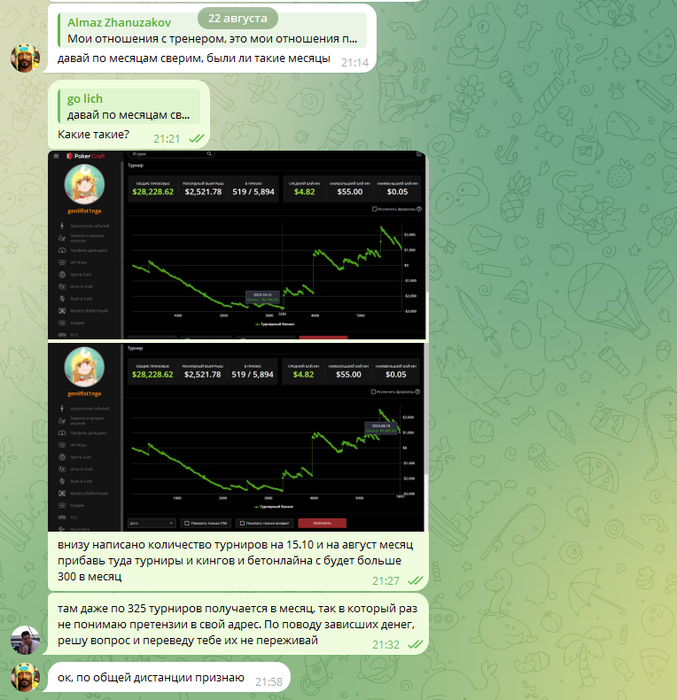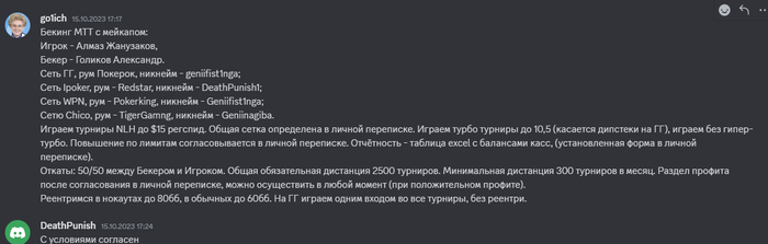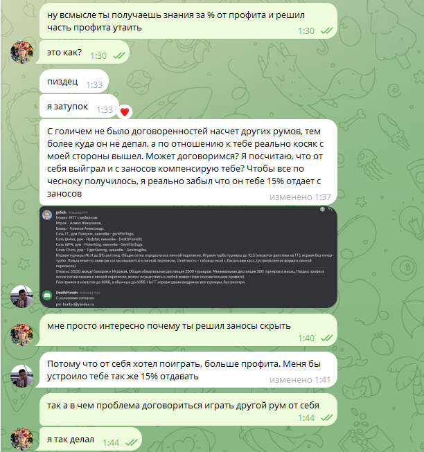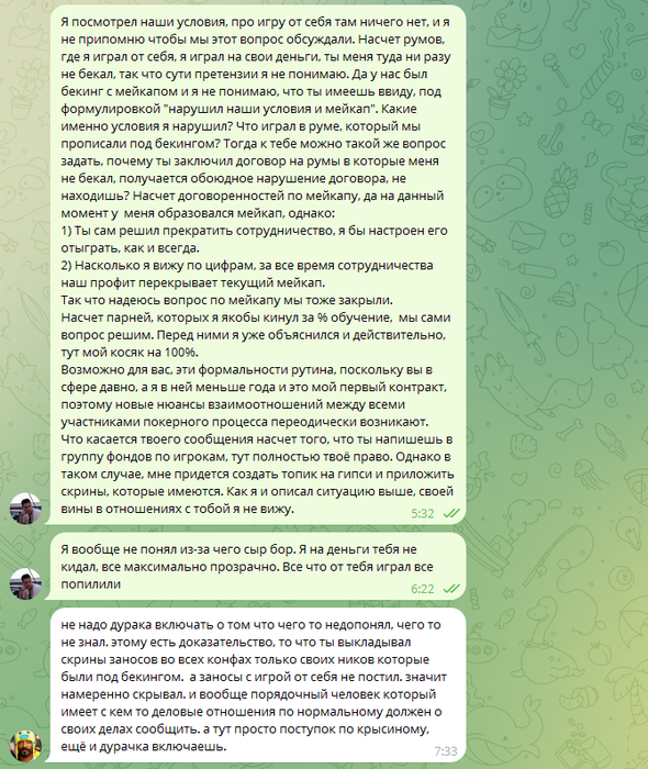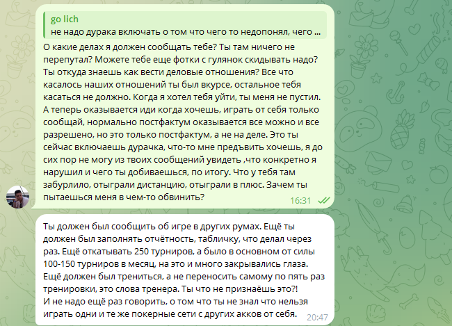 Он завел на меня арбитраж в группе в дискорде, где состоят представители фондов, бекеры, админы GT. Доступа у меня туда нет, поэтому изложу события тут. Данный человек обвиняет меня в нарушении договоренностей и имеет ко мне финансовые претензии. Начну с того, что когда я принимал решение пойти в фонд или искать частного бекера, меня смущало количество условий в договоре, который предлагают фонды, поэтому я принял решение пойти к частному бекеру, условия сотрудничества с которым умещалось в одной короткое сообщение(скрин прилагаю). По поводу претензий, количество отыгранных турниров( скрины прилагаю, дистанция была выполнена в полном объёме). По поводу финансовой претензии, мы дистанцию отыграли в плюс, даже с учетом мейка на момент разрыва отношений( скрины прилагаю). Поэтому я искренне не понимаю, о какой финансовой претензии ко мне он пишет. Я ни копейки у него не взял, весь рейк шел в общую кассу. Так же после его лжи , ему показалось мало и он начал писать в покерные конфы, где я состоял, что я скамер, чтобы меня оттуда кикнули. Так же начал оскорблять меня в личной переписке, ссылаясь на то, что мол у нас устные договоренности были насчет игры от себя и много чего еще. Впринципе, что я ему не говорил, о своих заносах считаю, довольно обоснованной позицией, потому что вон как у человека забурлило, жадность штука страшная. Помогите данному человеку, еще раз прочитать условия нашего сотрудничества, и помогите сложить цифры, потому что самостоятельно он видимо не справляется, чтобы он наконец понял, что его претензии шутка его эго и воображения. И если кто-то тут будет из конфы в дискорде куда он претензию закинул отправьте им мой топик, заранее благодарю.