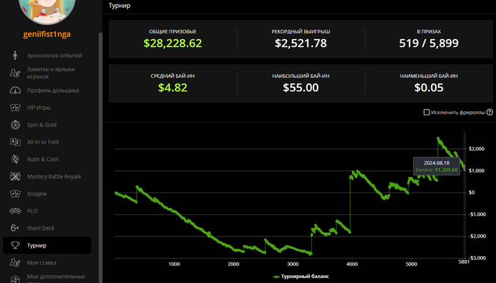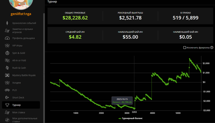 Количество турниров 3425 на 10.5 месяцев 325 турнира в месяц. Профит 3800+1530-532=4798.