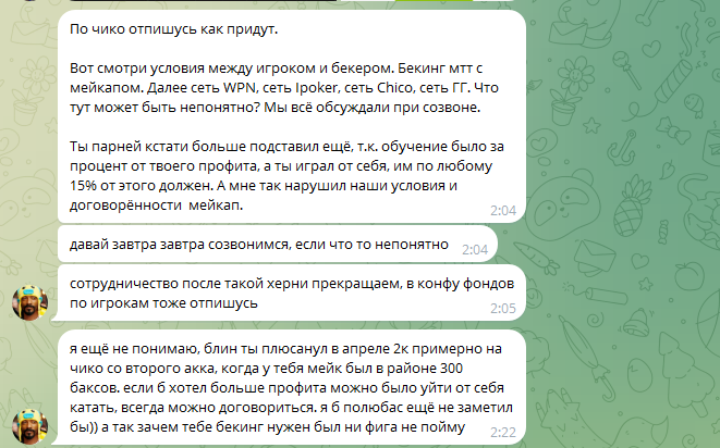 У нас был бекинг с обучением, спустя несколько месяцев сотрудничества, начал начал тайно играть от себя в сети Chico, Ipoker, WPN на других витринах. Ту же самую согласованную с ним сетку турниров входящий в наш пакет. Условия были записаны кратко, все основные моменты были обговорены устно при созвоне. Игрок прекрасно знал, что нельзя играть от себя. Сейчас включает дурака, что не понимает о чём идёт речь. Он состоял в нескольких конфах, где я тоже был, и постил туда заносы исключительно по бекингу. Это подтверждает его корыстный умысел, т.е. получая услуги по бекингу и обучению, жёстко экплуатировал систему обучения с бекингом. Обучая его за процент от профита, тренера недополучали от его игры. Сейчас нагло обманывает, то что он не понимает о чём идёт речь. Категорически не рекомендую к сотрудничеству и иметь с ним финансовых дел. Человек крайне гнилой, хитрый и также неблагодарный. После такой хуйни и твоего поведения, с таким человеком крысиного склада характера работать не собираюсь. И другим не рекомендую. Арбиртаж %200 считаю, что заслужил. Мой тебе совет на будущее думай о своих действиях и береги репутацию с молоду.