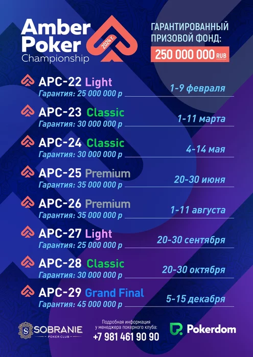 По всем возникшим вопросам можете звонить по телефону +7 (981) 461-90-90, также доступен WhatsApp, Telegram или Viber. Или просто задайте свой вопрос в данной теме! Ждём Вас в казино SOBRANIE! Друзья, до скорой встречи на Amber Poker Championship-27!
