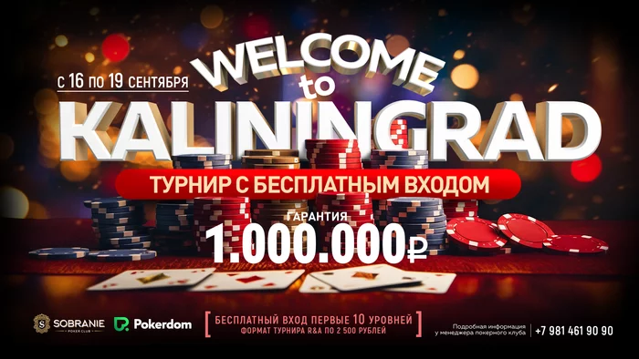 Welcome to Kaliningrad, который пройдет с 17 по 19 сентября, даёт возможность всем желающим не только бесплатно потрогать турнирные фишки и насладиться игрой, но еще и выиграть неплохую сумму.