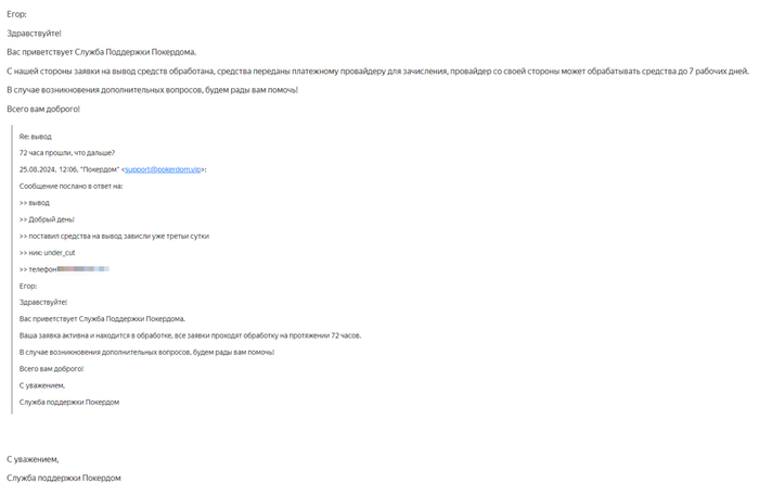22 августа денег также не поступало, и я снова написал в поддержку, тк статус заявки "выполнено" меня настораживал. В ответ я получил похожую отписку, но срок увеличился до 7-ми дней. Я решил зафиксировать это на форуме 23 числа в профильной теме ПОКЕРДОМ.