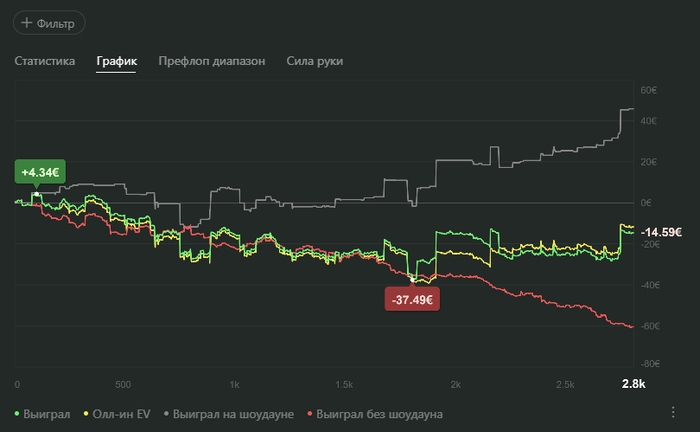 Когда я завел блог, у меня появилось новое чувство. Связано оно с тем, что мне поскорее хочется выложить новые результаты. Не знаю почему, но я всегда кайфовал от результатов других игроков на форуме. Кто-то выложил плохие результаты - кайф, я не один такой. Кто-то выложил хорошие результаты - кайф, хочу такие же. Как будто какая-то новая мотивация появляется. Прошуршал тут форум и встретил пару ребят, у которых красная вверх, результаты двузначные и все это на хейтерском руме без статистики. Аж зависть распирает. Я так понимаю, это последствия многочасовых работ в софте? Или у людей изначально такая установка в голове - душить всех нахуй?😃