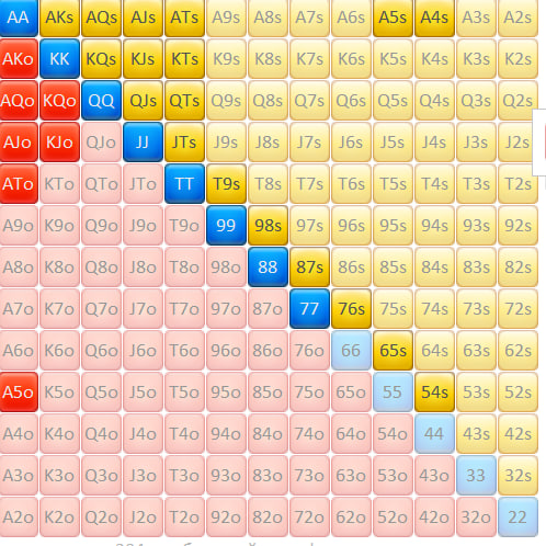 BB 3бетит полярно, чтобы сразу на префлопе избавиться от части доминаций по флешам и стритам. Ну, например, с 65s ты не прочь повыбивать слабые рваные мастевые руки, типа J6s, Q4s, K2s у BU, чтобы не отдаваться по флешам и попаданиям (собрать трипс-в-трипс с худшим кикером может стоить стека, лучше выдавить оппа на префлопе). Избавить BU от разномастных коннекторов, чтобы поменьше конкурировать за стриты.