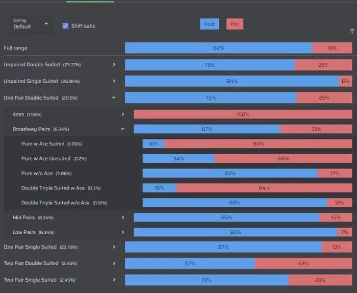 Не думаю, что открывать таких тузов из утг это хорошая идея. В реальных играх люди сильно чаще коллируют, чем то, что есть в солверных симуляциях. В итоге мы будем играть мультипоты, которые невозможно в плюс вытягивать с такими руками. Что думаете?