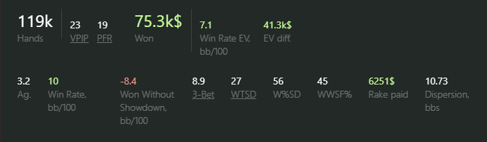 Прилагаю график за последнее время. Я попытался собрать статистику за последний год, но половину данных либо потерял, либо не смог найти. На графике лимиты от нл10 до нл100 на 119к рук.