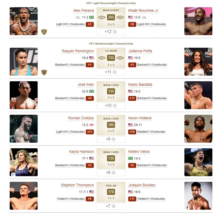 В главном бою чемпион Alex Pereira встретится с Khalil Rountree Jr. Очень много вопросов, почему именно Халили будет драться за титул. Все ждали, что Магомед Анкалаев будет претендентом, но Пирейра явно не стремиться с ним драться. А Дана не хочет видеть дагестанского бойца чемпом из-за его низкой медийности.
