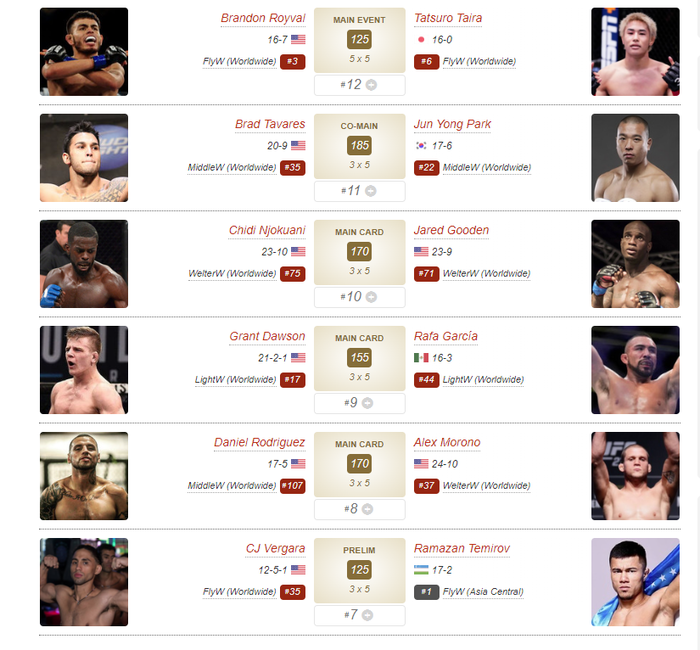 Сегодня будет не номерной турнир, в главном бою Brandon Royval встретиться с Tatsuro Taira. Тайра идет хорошим фаворитом, рекорду него 16 0. Но я думаю Брандон может удивить, если бой зайдет в поздние раунды( главное ему уйти от партера).