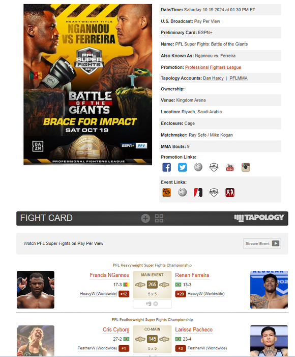 Так же сегодня будет еще один интересный турнир - Pfl Super Fights: Battle of the Giants. Бывший чемпион Ufc в тяжелом весе Francis Ngannou встретиться с Renana Ferreira. Френсис после ухода из Ufc провел два хайповых боя по правилам бокса. Он многих удивил, проиграв лишь раздельным решение Фьюри. Его противник - бразилец Renan Ferreira. Главный вопрос: есть ли еще мотивация у Нгауну драться!