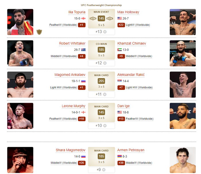 В главном бою Чемп Ilia Topuria встретится с Max Holloway. Макс - боец, который мне всегда нравился, но с Топурией ему будет тяжело, особенно в первых раундах. Если бой зайдет в поздние раунды, то гаваец может удивить.