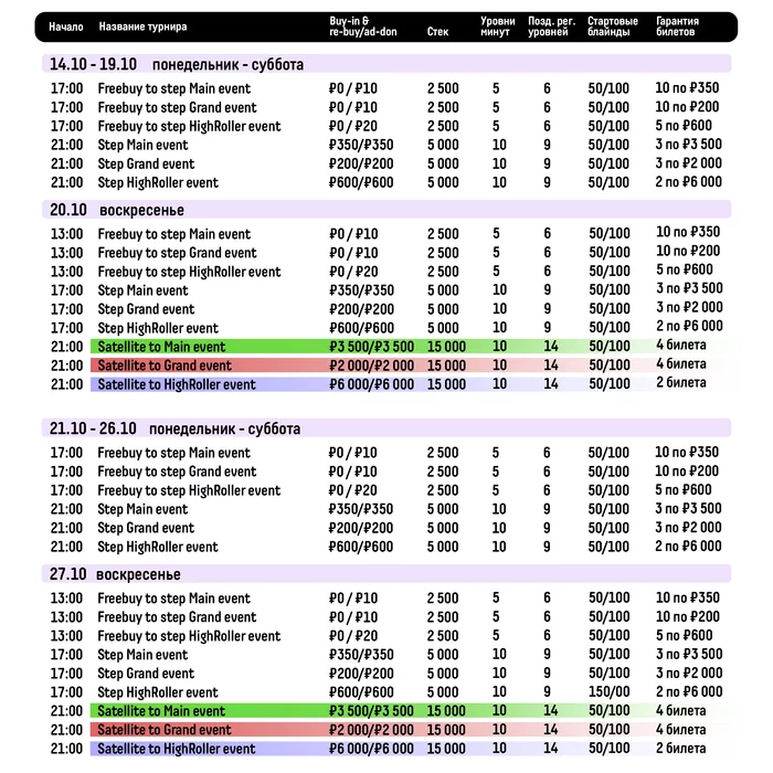 Выиграть путевку в живой турнир можно не потратив ни копейки. 😎 Каждый день с 14 по 27 октября через фрибайи и степы будет проходить отбор в финальные сателлиты. По воскресеньям (20 и 27 октября) разыграем путевки в 3 главных турнира: Main event, Grand event и High Roller event. Общая гарантия 20 проходок, но обычно «набивается» 40-50 билетов. 🔥