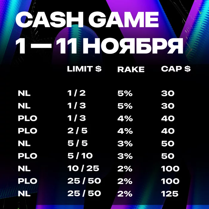 Ежедневно ~ 17:00 открываются 4+ стола по Холдему и Омахе с лимитами от $1/$2 и $5/$5. Уточняйте у кеш-менеджера на площадке или в телеграм-чате о специальных условиях по питанию и проживанию для кеш-игроков.