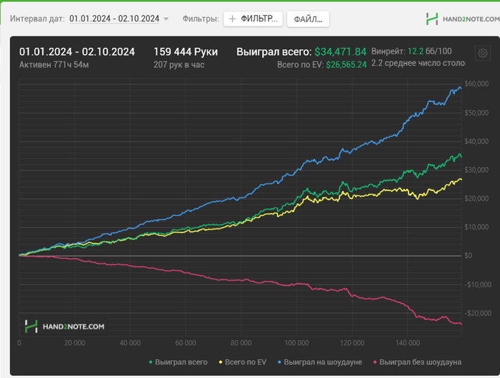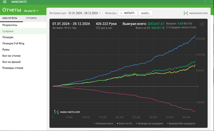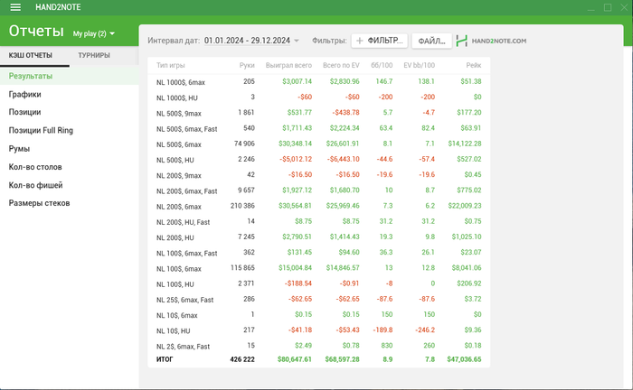 Результат за год на румах PokerSrars и 888poker , также в конце года начал играть в сети WPN и пока плюс 2к за 15к рук.