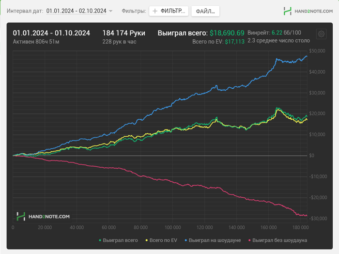 Reshetov @ 03.10.24Skyalen, как написал ранее поднялся за 2 года. поднимался плавно не пропуская не один лимит ( сначала нл10 потом нл25 потом нл50 и так далее ). Больше всего прокачала меня работа в группе с трех человек. Разбираем раздачи на логику и считаем их в программах( Flopzilla , GTO+) . Также активно юзаем визард ( наверное с запасом топ 1 инструмент для работы над игрой ).