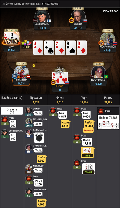 Ну привет , первая неделя подходит к концу а я уже наверное наигрался , на самом деле хоть может я и плох в каких то моментах но не должно же так заливать в одни ворота , просто пздц какой то. Признаюсь конечно пишу эту статью с пылу и жару , но хочется рассказать про сегодняшний день , пришел с работы отдохнул , настроился на каточку , зашел с позитивным настроении ( на самом деле где то даже читал про это , что если нет настроения даже нет смысла заходить в эту игру) ) запустил 25 варм апп и 15 баунти еще 2 стола подешевле , вообще нашел для себя комфортное место играть в 4 стола , так как опыта сейчас маловато и чтоб внимательно играть и кайфовать от этой игры! И так , 25 начало не оч заходило просто сидели фолдили , может 2-3 раза сыграли опен но ничего там не нашли. И как то пришли 22 на бб , ранняя рейз2.2бб батон колл я на бб решил подколить флоп ловим сет но на доске флеш дро,борт низкий , донкать не стал решил сыграть чек так как не в позе , ранняя рейз 35% средняя колл , я колл ( не стал рейзиь так как решил добрать со старших пар флешь дро и каких нибудь AK с гатшотным натц флешь дро , терн получили спарку 7 и она же закрывает флешь , я чек ( решаю что фсе равно будет ставить рейзер так как он достаточно активный), ранняя рейз пол пота , средняя колл , я колл ( хз сейчас конечно я думаю может надо было там алл ин ставить , но я посчитал нужным сыграть колл тк как мы начали добирать с 7 с доехавшего флешь дро и всего прочего), ривер Q , у меня где то 50-60 бб , я донк пол пота ( опять же решил просто добрать фишки с сетов и флешей ) ранняя алл ин 70 бб , батон рейз алл ин 100 бб, не знаю может и плохой колл я понимаю что у меня самый малый фулл но я нажал колл.