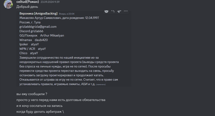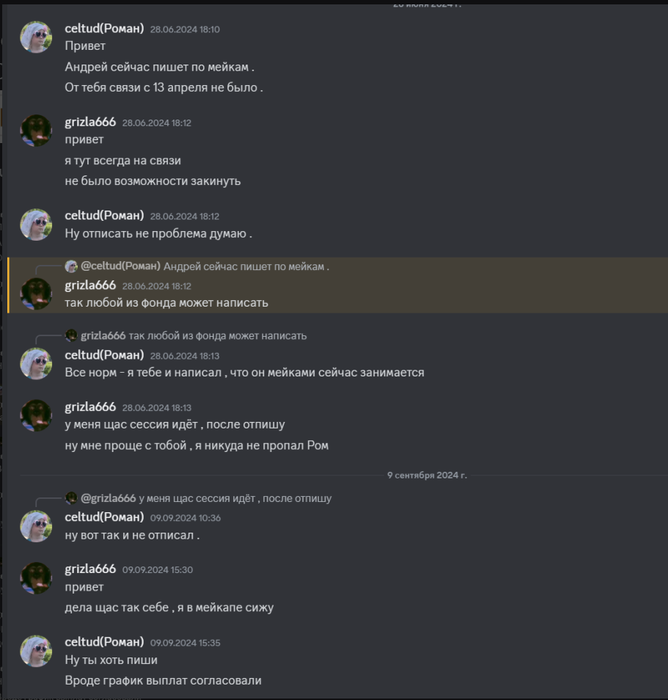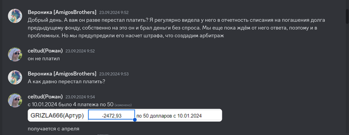 После размещения данных игрока на соответствующем ресурсе как «ненадёжного игрока», с нами на связь вышли представители фонда NAMTT, в котором ранее состоял игрок. В процессе общения выяснилось, что игрок с апреля 2024 года перестал выплачивать им долг согласно графику выплат. Обратившись к нашим данным, мы увидели, что часть несогласованных выводов была помечена комментарием «закрытие мейка в прошлом фонде», что, как выяснилось, с апреля этого года перестало соответствовать действительности. В итоге игрок средства проекта перевёл не в полном объёме, долг по селекту не признаёт, на связь не выходит с 30.09.24.