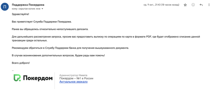 Сейчас же для зачисления средств рекомендуем отправить запрошенные поддержкой рума документы.