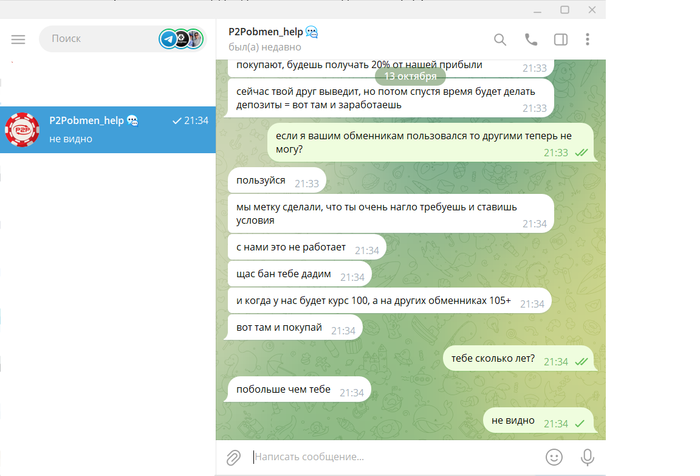 Решил я спросить у поддержки P2Pobmen.com, есть ли бонусы если приведу друга и он выведет 1к-1.5к долларов через сайт. Поддержка ответила что нету таких бонусов и я просто написал что воспользуюсь другим обменников и тут начались странные угрозы)