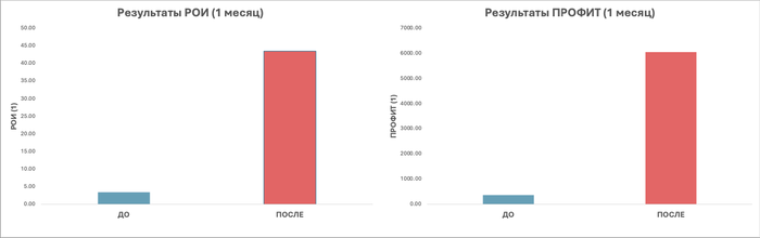 Cравнение РОИ и ПРОФИТА у игроков которые до индивидуального занятия показали РОИ меньше нуля. После тренировки РОИ колеблется в диапазоне от 10% до 70%, ПРОФИТ от 1000$ до 6000$.