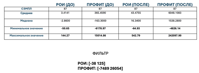 Но надо чуть глубже смотреть, потому что не все игроки приходят во время даунстрика. К тому же диспа суровая штука и важно смотреть разницу на показателях РОИ, которые будут чаще всего. В таблице ниже можно посмотреть на полный диапазон РОИ и ПРОФИТА на моей выборке. Важно отметить, что есть и минусовые показатели РОИ после тренировки. Также видны запредельные результаты РОИ больше 100 как до, так и после тренировки. Я просимулировал дистанцию в один месяц (https://www.primedope.com/tournament-variance-calculator/) и получил 95% доверительный интервал для РОИ и ПРОФИТА, который вы видите в графе ФИЛЬТР ниже таблицы. Этот фильтр был использован чтобы обрезать маловероятные результаты на основе симуляции. Фильтр обрезал сэмпл игроков до 71.