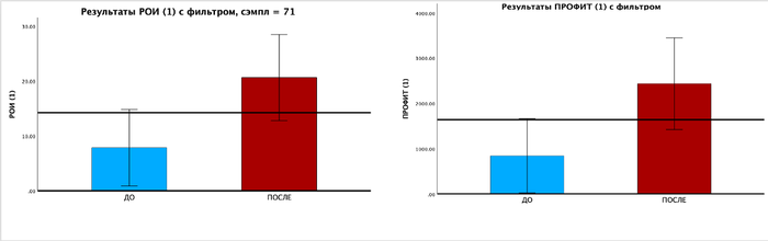 Разница в РОИ и ПРОФИТЕ до и после ментальной тренировки после использования фильтра. Жирная линия примерно по центру графика — среднее значение РОИ и ПРОФИТА по выборке. Линии на каждом из столбцов — 95% доверительный интервал. Как видим, даже если обрезать маловероятные результаты, то после индивидуального занятия у игроков существенно лучше результаты. До тренировки РОИ колеблется в диапазоне от 0 до 15%, после от 15% до 30%. ПРОФИТ колеблется от 0 до 1800$ до тренировки, после от 1500$ до 3500$.
