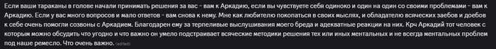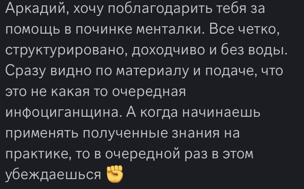 Красавчик в своем деле😎 ! Отдан на все сто и любит то чем занимается! подход к проблемным вопросам,максимально углубленный, что приводит к четкому пониманию корня проблемы и построения плана работы над искоренением ее! Уверен:дополнительный огромный и жирый ++++++ , он сам хороший Рег ( что делает его самородком в индустрии геймблинга, и предоставлении неоценимой помощи, работяге, у которого вот вот крыша протечет от витков диспы )! Западные психологи его уровня ( к его прайсу добавляют еще несколько нолей ( чекал офлайн психологов )! Спасибо что помогаешь и уверен многим еще окажешь неоценимую помощь !