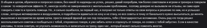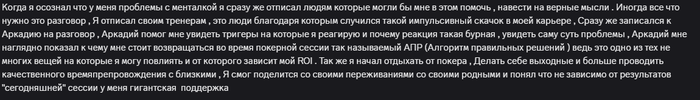 Несколько раз брал трени у Аркадия. Аркадий профи, причем постоянно прогрессирующий. Для меня было важно, что он сам в прошлом успешный покерист. Скоро еще забегу на трену) Давно не был)