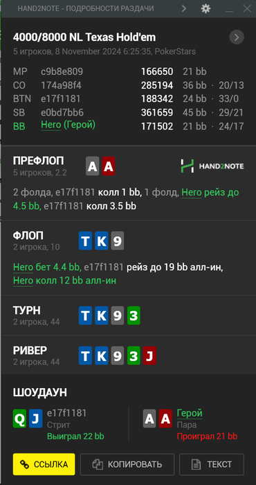 Кажется мой дневник превращается в монолог, но энтузиазм продолжать еще не пропал. Чет вчерашняя сессия была не слишком удачной. Сильно переиграл руку в начале турнира на ББ, чем заруинил всю ЕВЭ на этой позиции из-за проигрыша 200 бб. Недодача под конец сильно ощущалась, поэтому после 4х часов загрузки решил стопнуть такую катку.
