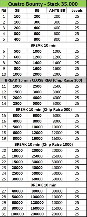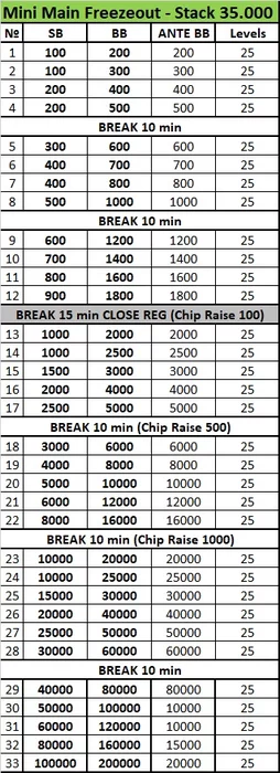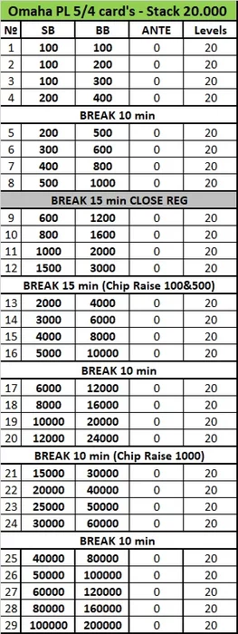 Возможно сделать 2 add-on стоимостью 100 у.е. = стек 25000 фишек, но только тем игрокам, которые вступили в игру до начала 6-ого уровня.