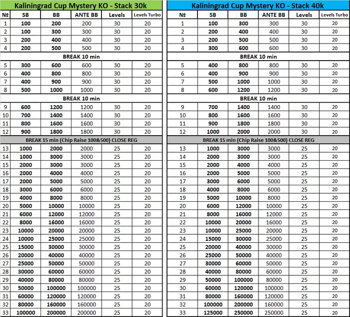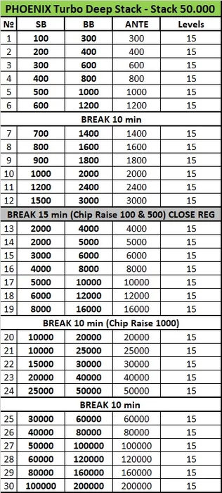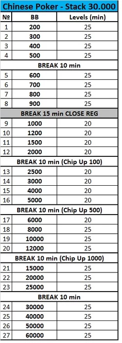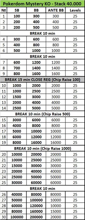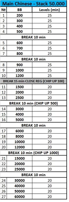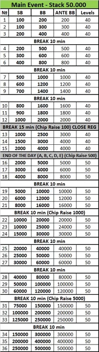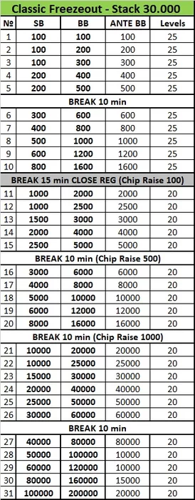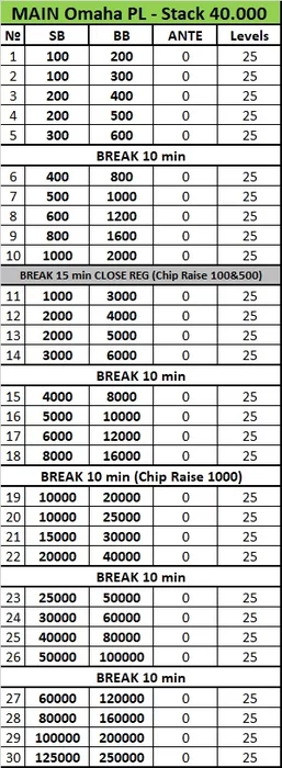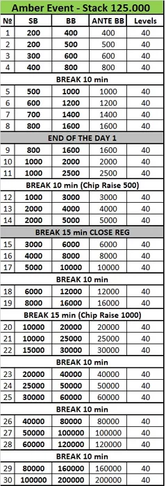 Стартовый стек – 50 000 фишек, уровни по 40 минут, а на финальном столе по 60 минут.
