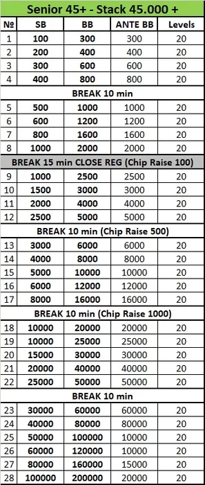 - Seniors Event 45+ - турнир, в который не пускают молодежь, только самых настоящих сеньоров. Причем чем старше участник, тем больший стартовый стек он получает в своё распоряжение в начале турнира. Здесь всегда очень благородная и неспешная атмосфера.