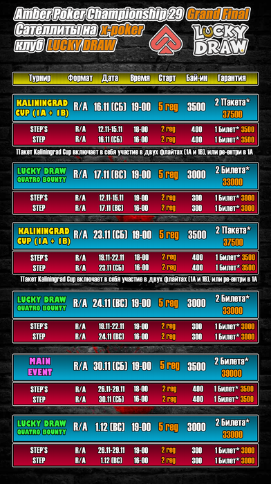 В мобильном приложении X-Poker (клуб Lucky Draw) в 1️⃣8️⃣:0️⃣0️⃣мск (либо в 17:00 по Калининграду) состоится онлайн сателлит к турниру Main Event Day 1A.