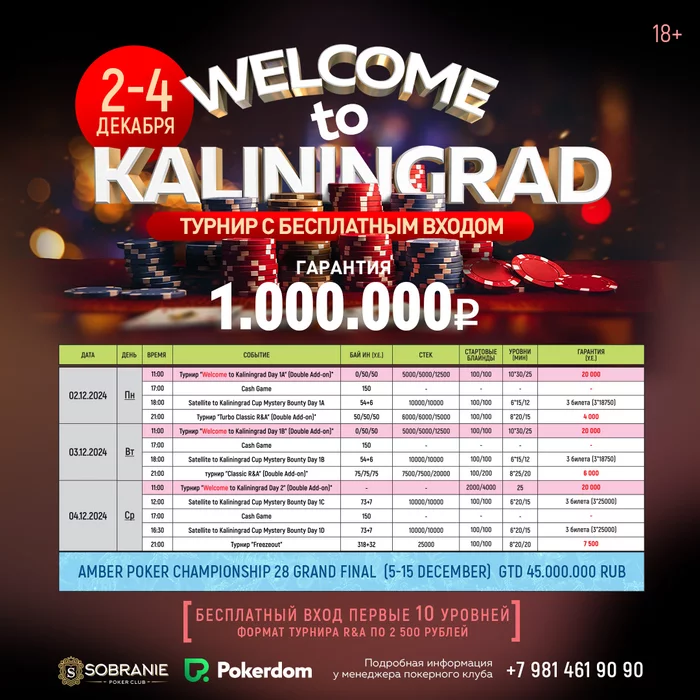 Уже завтра 2 декабря в 11:00 стартует приветственный турнир Welcome to Kaliningrad с бесплатным входом и гарантией 1.000.000 рублей.