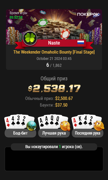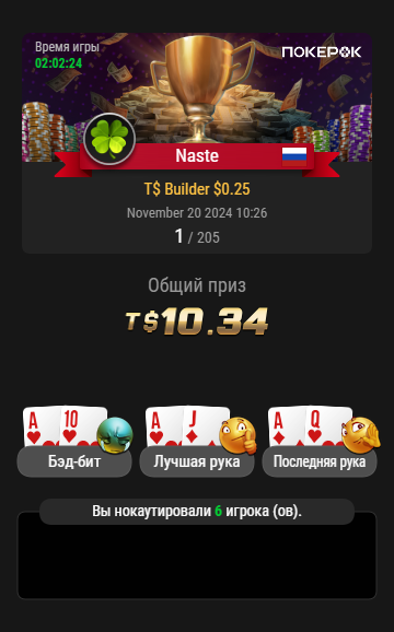 Минусы: Хоть я и выиграла на Покерок, но очень не нанадежный рум. Хорошо, что там денежных средств уже не было , успела вывести. ГСЧ на нем- это натуральный слот . За 200 турниров, что я сыграла , шансы оппов с 10% закрывались, чаще чем 90%. Непонятная игра ботов в игре, которые скидывают карты не играющим игрокам, а также колируют все подряд ,с доездом на ривере и терне. Разработчикам даного рума на столько плевать на репутацию, что явно не скрывают и это видно любому трезвому человеку : боты в игре, подкрутка терна и ривера, блоки игровых акакунтов в любой момент.