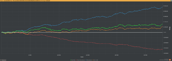 Хотя на самом деле, эти хлипкие итоги являются квинтэссенцией последних 3-4 лет и отражают именно такой отрезок времени, т.к уже несколько лет я не смотрел и не интересовался своими годовыми отчётами, не стремился проходить лимиты, год за годом плывя по волнам дисперсии без заданного маршрута и конечной цели, а это, в свою очередь, основная характеристика моего отношения к покеру. Сейчас, сравнивая результаты, могу сказать, что он провальный т.к , практически по всем показателям я не смог прибавить в сравнении со своими предыдущими годами, хотя уровень своего понимания игры вырос. Отчасти сыграла, наверное, диспа, пусть и на графике этого особо не видно, но последние месяца три, весь постфлоп в раздутых банках, особенно на полтинике, был отдан из-за тотального непопадания в доску. Именно поэтому я не стал постить что-то сюда , тк не хотелось каждый раз писать про херовый ран и сетовать на затянувшийся даун при своей “идеальной” игре