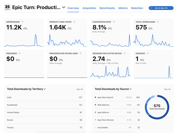 Тут интересный параметр Product Page View - это количество пользователей, которые из ленты перешли на страницу приложения, чтобы посмотреть подробней скриншоты и прочитать описание.