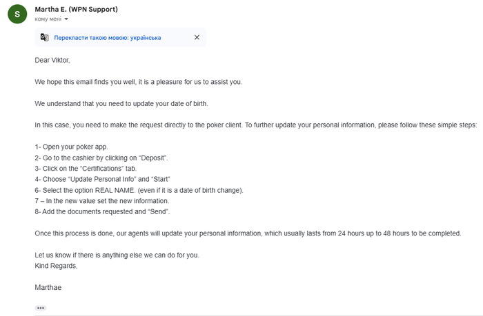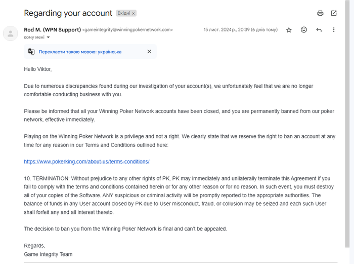 - Спустя некоторое время увидел, что мои данные успешно обновили и инфа теперь соответствует действительности. И вроде тем же вечером я получил письмо о бане. Пишу аффу, тот мне отвечает, что впервые сталкивается с подобным, он в недоумении не меньше меня. Обещает связаться с менеджерами напрямую.