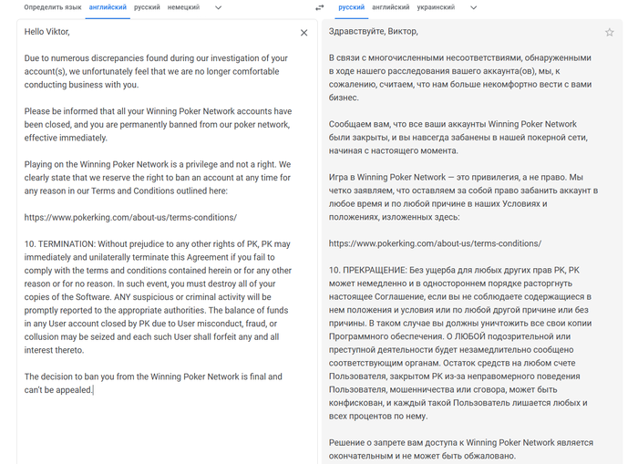SmellsLikeFish, А ты бесстрашный! Промониторил бы ситуацию что WPN щас постоянно банит (я как то писал в ленте рума https://forum.gipsyteam.ru/index.php?viewtopic=111260&view=findpost&p=7897358) и многим это оказалось пофиг, еще и деп в 2к! У тебя за 9 лет ака на джипси наверняка есть аки в Покеркинге, или в других витринах WPN. Но даже так они ахерели конфисковывать средства! Мое мнение что лучше вообще не играть в покер, чем у них играть, особенно с сообщения - игра в WPN это "привилегия а не право", лол, ЧСВ до небес у них...