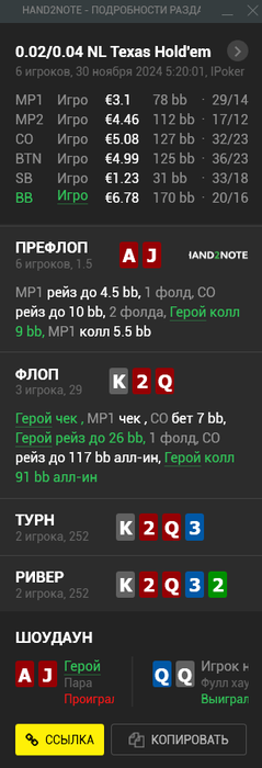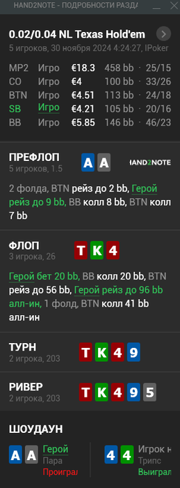 Играть 4бет испугался, решил что опеном 4.5 и кликачем, там может быть что-то сильное, но свою руку решил не сбрасывать и сыграть колл-фолд на пуш.