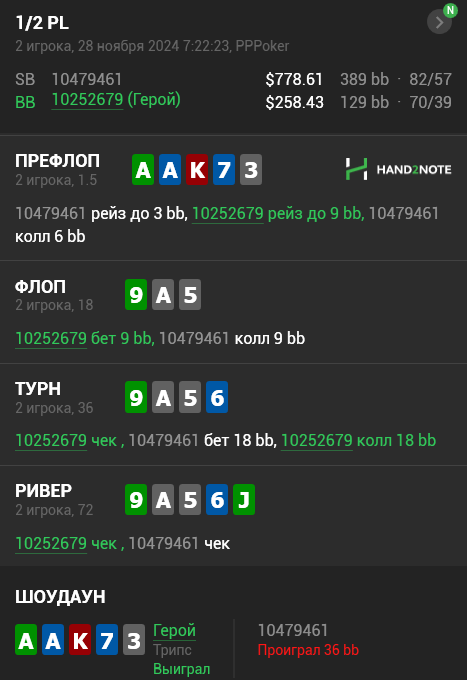 Я долгое время "приучал" оппа к своему частому бету ривера именно ставкой 1/2 (до этого ставил пот - он много раз выбрасывал), а блефов у меня он увидел достаточно - вскрывал уже пару раз и в какой-то момент даже начал рейзить этот спот и я выбрасывал. При такой динамике я решил подождать нужный спот, чтобы отложить весь свой топ диапазона до ривера и поймать в ловушку. :)