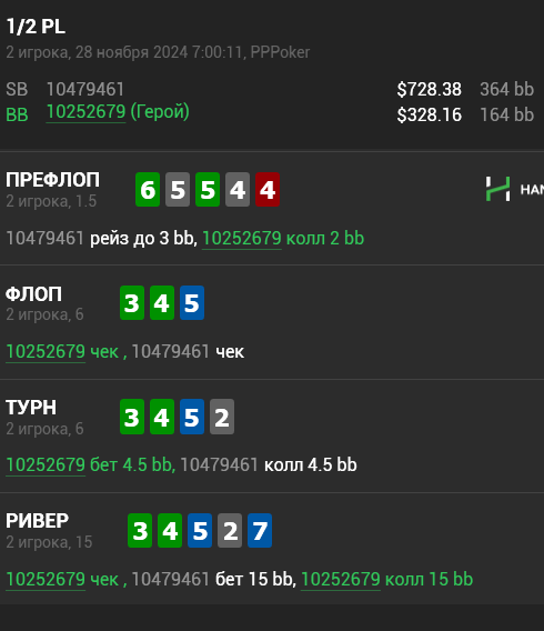 Не могу утверждать на 100%, но опп знает, что я знаю, что он способен узко изображать ривер/ превращать в блеф/ т.е. очень полярен. И здесь с моей стороны стратегическая ошибка: с натсами/блефами я ставлю сам + динамика матча сложилась так, что я не заметил как опп подстроился - у меня возник перекос в сторону блаф-кэтча, т.к. часто вскрывал его ранее. В какой-то момент он начал добирать ставкой в пот, а с низом диапа просто сдавался. Я залевелил сам себя и вколил. :)