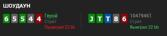 Добавлю, что при 1ых шоудаунах не так просто сразу судить о прибыльности матча - он щас ставил в блеф без блокеров потому что я все улицы чекал и он нападает на слабость или он вообще о таких вещах не задумывается? А может я сам для него сейчас "черный ящик" и он меня прощупывает. Тут один шоудаун должен подтвердиться следующими...и будет выстраиваться образ этого игрока. Ну лично у меня так :)