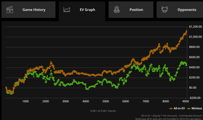 Также, возможно, я нашёл причину неудачных игровых сессий: усталость и отсутствие разминки. Стоило устранить эти факторы — и игра улучшилась. Постараюсь продолжить внедрять рабочую технику для максимизации моей игры в покере. Но есть и другая сложность: если сначала играть в покер, а потом работать, то на работу не хватает энергии. Если наоборот — на покер уже сил мало, и винрейты падают. Работу с низкой энергией можно выполнить, если задачи несложные, а вот с покером этот трюк не проходит. Поэтому буду стараться работать после игровой сессии, если в этот день не намечаются трудные задачи.