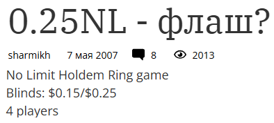 Немного о себе. Играть начал когда деревья были большими... Трансляции EPT, Pokerstars на фантики, в общем всё как у многих в то время. Надо отметить, что тогда на один стол безлимитного Texas Hold'em приходилось 5-10 столов лимитного. В книжках умные люди писали о том, что коммерческий безлимитный едва ли возможен, потому что очень уж быстро рыба там будет сливать свои кровные. То что сейчас называют NL25, тогда было NL0.25
